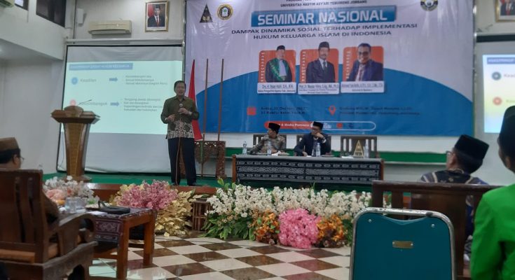 JOMBANG, MEDIA NUSANTARA.Com-Seminar Nasional bertajuk ” Dampak Dinamika Sosial terhadap Implementasi Hukum Keluarga Islam (HKI) di Indonesia” menjadi daya tarik bagi para peserta yang hadir, terutama kalangan kampus. Seminar Nasional garapan Universitas Hasyim Asy’ari Tebu Ireng, Kabupaten Jombang, Jatim, ini berlangsung di Aula Lantai 3 Gedung KH Yusuf Hasyim, Tebu Ireng Jombang, Sabtu (26/10/2024) dengan mengundang dua tokoh pakar di bidangnya, yakni Ketua Pengadilan Negeri Agama Jombang Drs H Ihsan Halik, SH, MH serta Guru Besar Sosiologi dan Direktur Pasca Sarjana dari UIN Sunan Ampel Surabaya Prof Dr Masdar Hilmy, SAg, MA, PH,D.