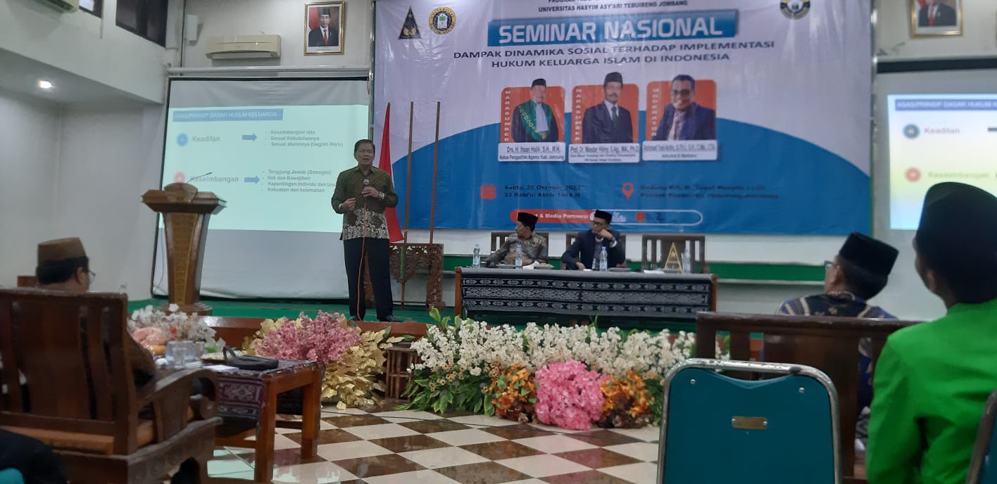 JOMBANG, MEDIA NUSANTARA.Com-Seminar Nasional bertajuk ” Dampak Dinamika Sosial terhadap Implementasi Hukum Keluarga Islam (HKI) di Indonesia” menjadi daya tarik bagi para peserta yang hadir, terutama kalangan kampus. Seminar Nasional garapan Universitas Hasyim Asy’ari Tebu Ireng, Kabupaten Jombang, Jatim, ini berlangsung di Aula Lantai 3 Gedung KH Yusuf Hasyim, Tebu Ireng Jombang, Sabtu (26/10/2024) dengan mengundang dua tokoh pakar di bidangnya, yakni Ketua Pengadilan Negeri Agama Jombang Drs H Ihsan Halik, SH, MH serta Guru Besar Sosiologi dan Direktur Pasca Sarjana dari UIN Sunan Ampel Surabaya Prof Dr Masdar Hilmy, SAg, MA, PH,D.