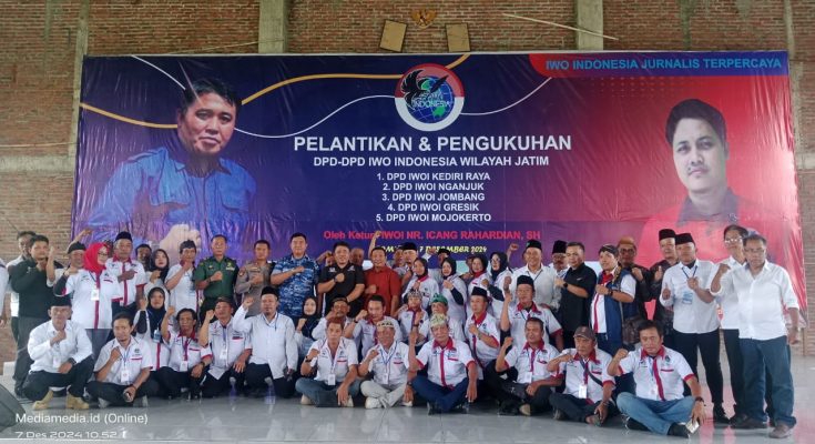 JOMBANG, MEDIA NUSANTARA– Ketua Umum DPP IWO Indonesia (IWOI) NR Icang Rahardian, SH secara resmi melantik dan mengukuhkan pengurus 4 DPD IWOI di Jatim yakni Kabupaten Jombang, Ngajuk, Kediri Raya dan Gresik yang berlangsung di Gedung Sekretariat PCNU Jl Gambiran Raya, Kecamatan Mojoagung, Kabupaten Jombang yang menghadirkan peserta dan sejumlah tamu undangan, Sabtu (7/12/2024).