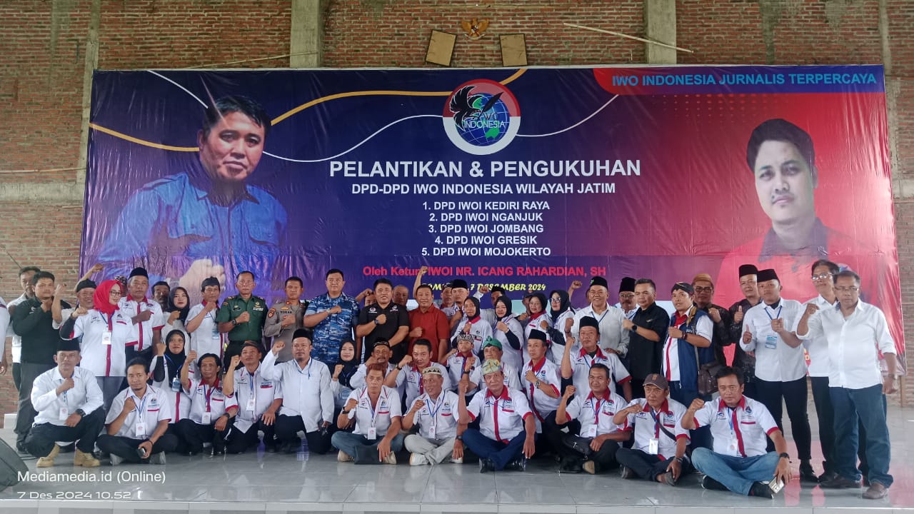 JOMBANG, MEDIA NUSANTARA– Ketua Umum DPP IWO Indonesia (IWOI) NR Icang Rahardian, SH secara resmi melantik dan mengukuhkan pengurus 4 DPD IWOI di Jatim yakni Kabupaten Jombang, Ngajuk, Kediri Raya dan Gresik yang berlangsung di Gedung Sekretariat PCNU Jl Gambiran Raya, Kecamatan Mojoagung, Kabupaten Jombang yang menghadirkan peserta dan sejumlah tamu undangan, Sabtu (7/12/2024).