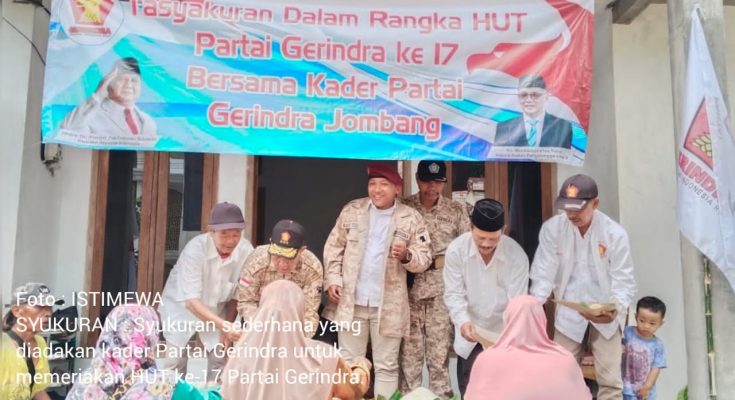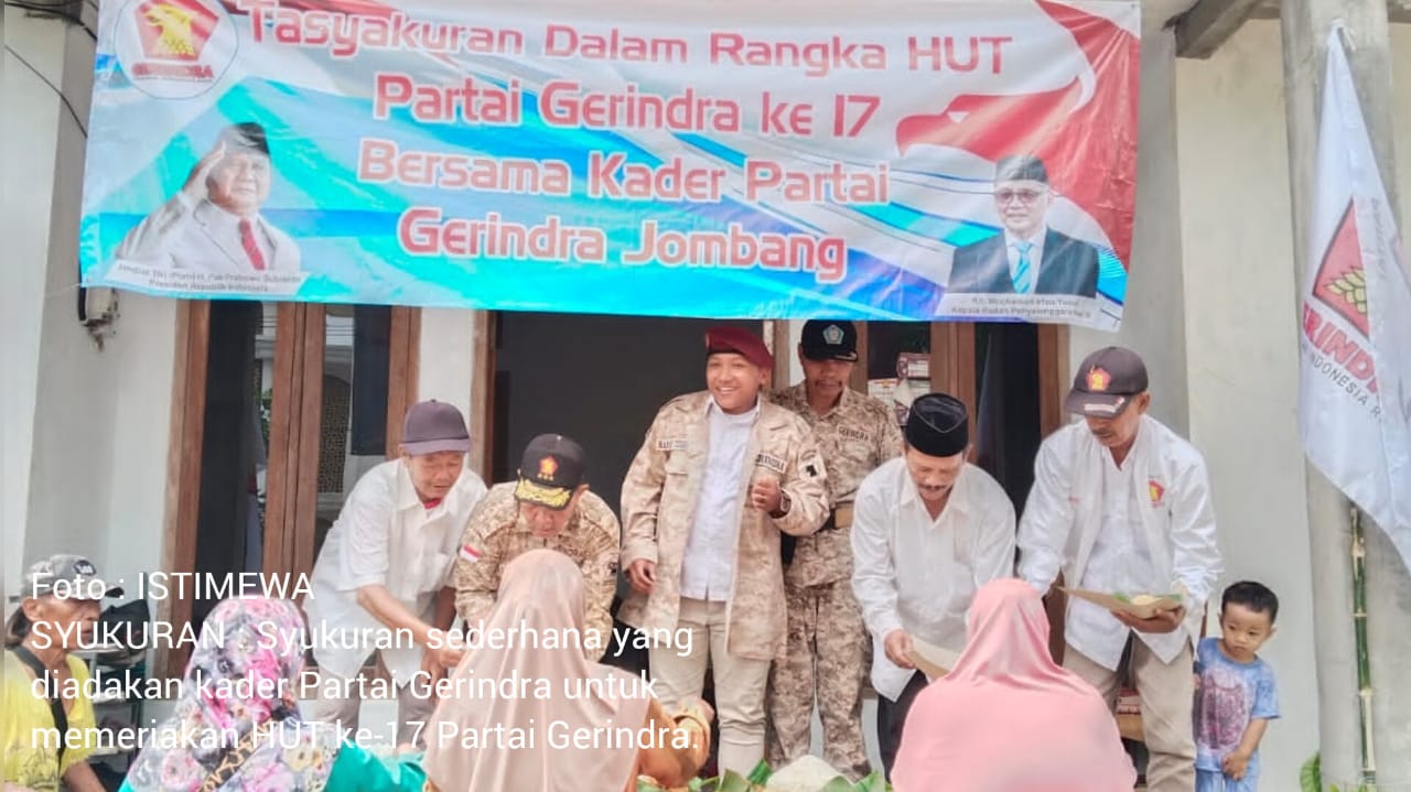 JOMBANG, MEDIA NUSANTARA.Com-Sejumlah kader Partai Gerindra Kabupaten Jombang menggelar tasyakuran sederhana penuh makna dalam rangka memperingati Hari Ulang Tahun ( HUT) ke- 17 Partai Gerindra di Desa Karobelah Kecamatan Mojoagung Kabupaten Jombang Jawa Timur, Minggu (9/2/2025).