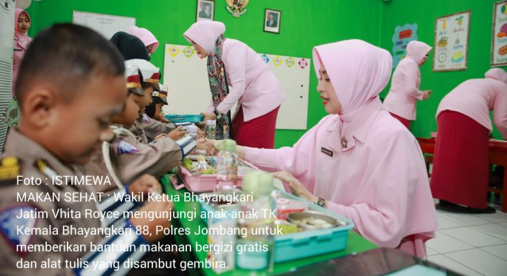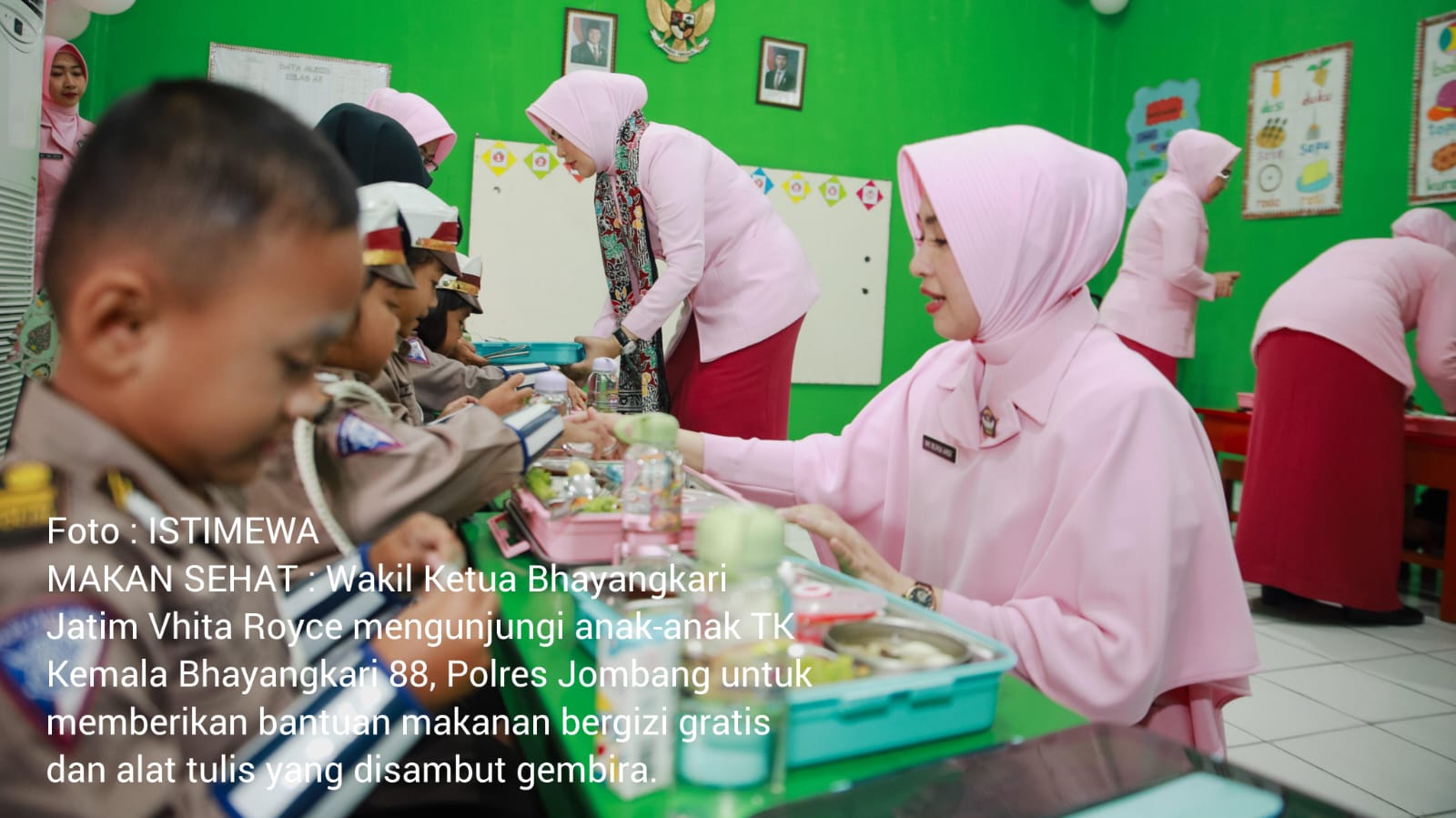 JOMBANG, MEDIA NUSANTARA.Com- Anak-anak TK Yayasan Kemala Bhayangkari 88 Jombang tampak ceria dan senang saat mendapatkan makan sehat gratis (MSG) dan juga kotak jajan hingga alat tulis dari Wakil Ketua Bhayangkari Daerah Jawa Timur Ny Vitha Royce.