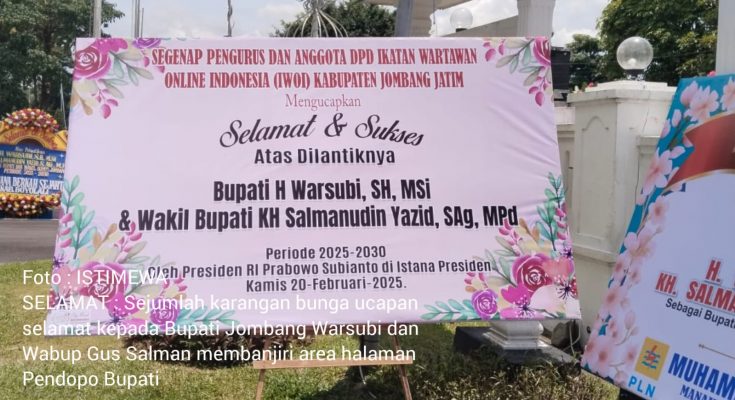 JOMBANG, MEDIA NUSANTARA-Sejumlah karangan bunga sebagai bentuk ucapan selamat dan sukses kepada Bupati Jombang H Warsubi dan Wakil Bupati H Salmanudin Yazid yang baru saja dilantik oleh Presiden RI Prabowo Subianto di Istana Kepresidenan, Kamis (20/2/2025) kemarin terus berdatangan dari perusahaan, pengusaha, ormas Islam, pengurus partai-partai politik dan lembaga NGO.