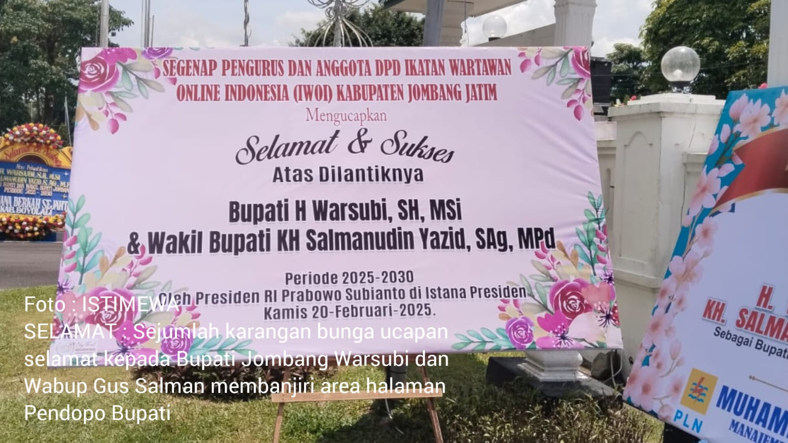 JOMBANG, MEDIA NUSANTARA-Sejumlah karangan bunga sebagai bentuk ucapan selamat dan sukses kepada Bupati Jombang H Warsubi dan Wakil Bupati H Salmanudin Yazid yang baru saja dilantik oleh Presiden RI Prabowo Subianto di Istana Kepresidenan, Kamis (20/2/2025) kemarin terus berdatangan dari perusahaan, pengusaha, ormas Islam, pengurus partai-partai politik dan lembaga NGO.