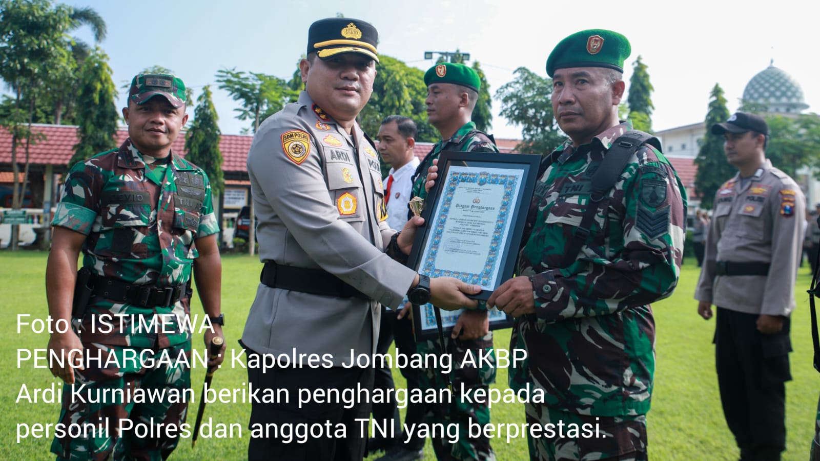 JOMBANG, MEDIA NUSANTARA.Com- Kapolres Jombang AKBP Ardi Kurniawan, S.H, S.I.K, CPHR memberikan penghargaan kepada 28 personil Polri dan 3 personil Kodim 0814 Jombang yang berprestasi bertempat di Lapangan Apel Polres Jombang, kemarin.