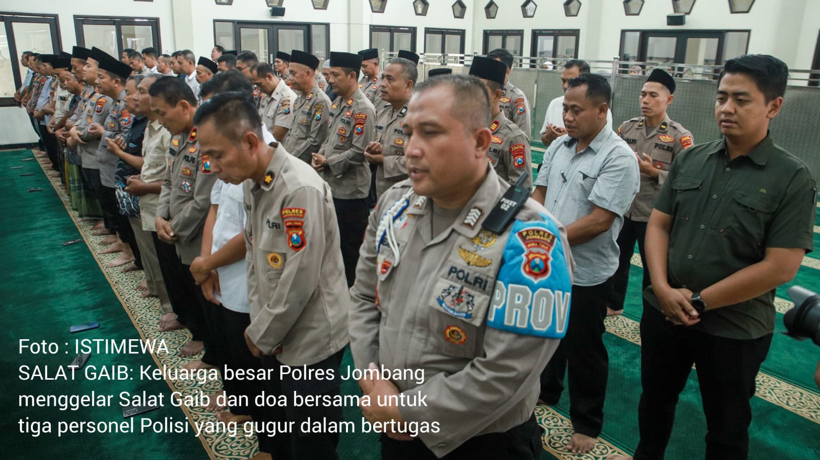 JOMBANG, MEDIA NUSANTARA.Com- Keluarga Besar Polres Jombang menggelar salat gaib dan doa bersama sebagai bentuk belasungkawa secara mendalam terhadap tiga personel Polri yang gugur saat menjalankan tugas di Kampung Karangmanik, Kecamatan Negara Batin, Kabupaten Way Kanan, Lampung, Senin, 17 Maret 2025.