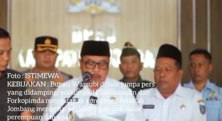 JOMBANG MEDIA NUSANTARA.Com-Bupati Jombang H Warsubi menyatakan komitmen Pemkab Jombang dalam melindungi hak dasar warganya, khususnya perempuan dan anak dari segala bentuk kekerasan. Pernyataan ini disampaikan dalam konferensi pers di Gedung DPRD Kabupaten Jombang, baru-baru ini yang dihadiri Wakil Bupati Salmanudin, Ketua DPRD Hadi Atmaji serta unsur Forum Koordinasi Pimpinan Daerah (Forkopimda).