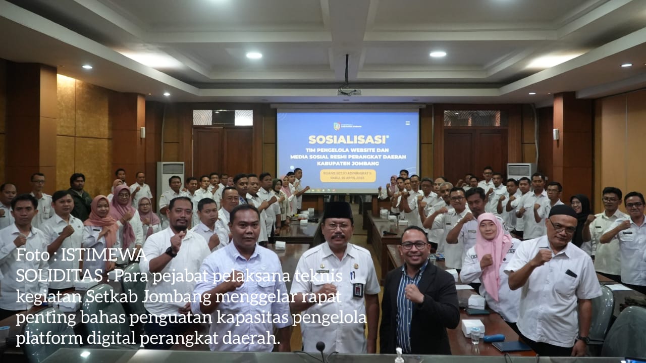 JOMBANG MEDIA NUSANTARA.Com – Pemerintah Kabupaten (Pemkab) Jombang melalui Dinas Komunikasi dan Informatika (Kominfo) Kabupaten Jombang menyelenggarakan kegiatan Penguatan Kapasitas Tim Pengelola Website dan Media Sosial Resmi seluruh Perangkat Daerah lingkup Pemkab Jombang, di Ruang Setjo Adiningrat, Kantor Setkab Jombang, Rabu (16/4/2025).