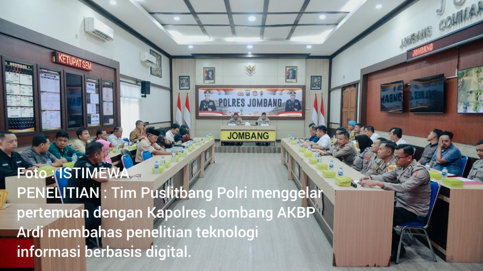 Tim Puslitbang Polri dipimpin oleh Kombes Pol Saefuddin Mohamad, S.I.K dengan anggota pembina Dwi Irawati, S.S, Penata Sultan Sorik, M.H dan Ipda Ajeng Hananingrum, S.Stat disambut hangat oleh Kapolres Jombang AKBP Ardi Kurniawan, S.H, S.I.K, CPHR di Ruang Jombang Command Center (JCC) Polres Jombang, Selasa (22/4/2025).