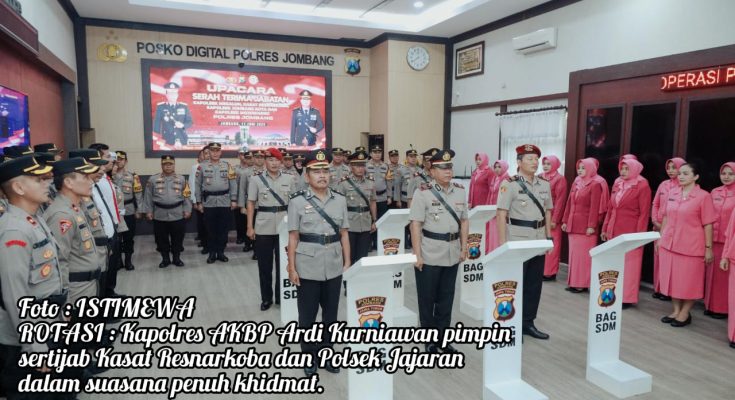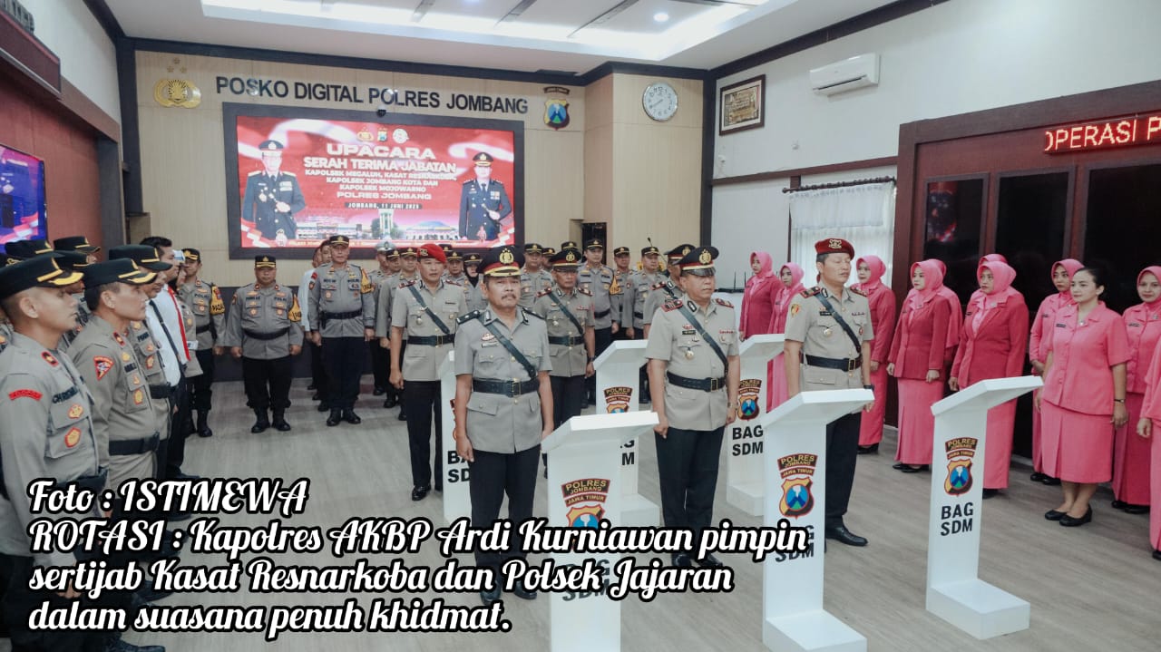 JOMBANG MEDIA NUSANTARA.Com- Kapolres Jombang AKBP Ardi Kurniawan, S.H, S.I.K, CPHR memimpin langsung upacara serah terima jabatan (sertijab) di lingkungan Polres Jombang, yang berlangsung khidmat di Ruang Jombang Comand Center (JCC), Rabu (11/6/2025) pagi. Upacara ini merupakan bagian dari rotasi dan penyegaran organisasi di jajaran Kepolisian Resor Jombang.
