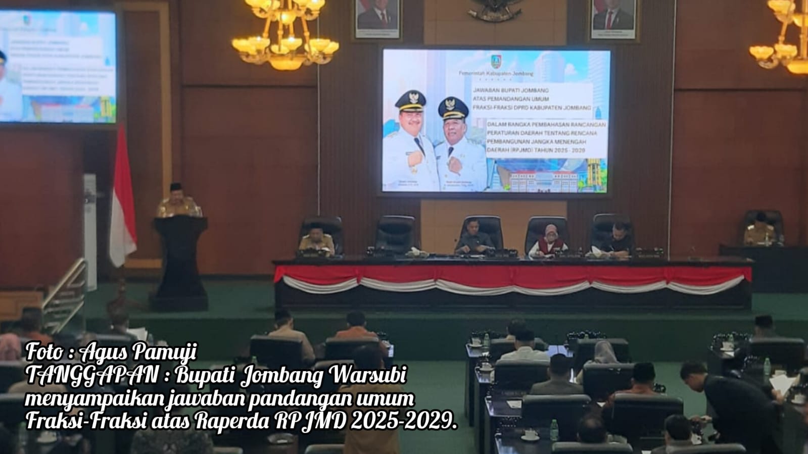 JOMBANG MEDIA NUSANTARA. Com- Bupati Jombang H Warsubi menyampaikan jawaban resmi terhadap pemandangan umum fraksi-fraksi DPRD Kabupaten Jombang dalam pembahasan Raperda RPJMD 2025–2029, Senin (23/6/2025).