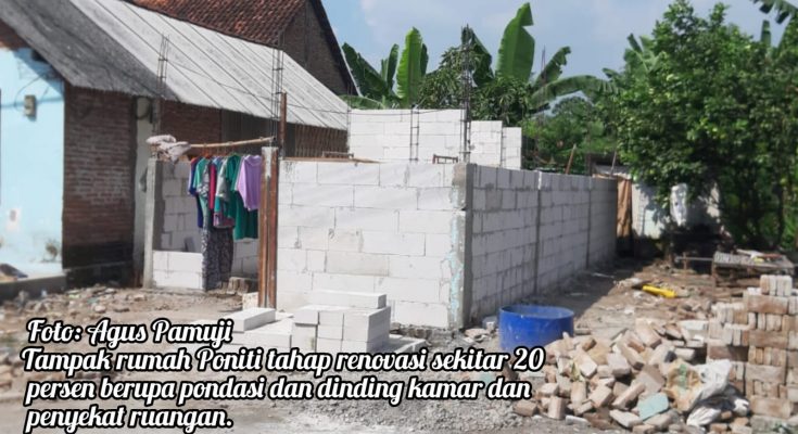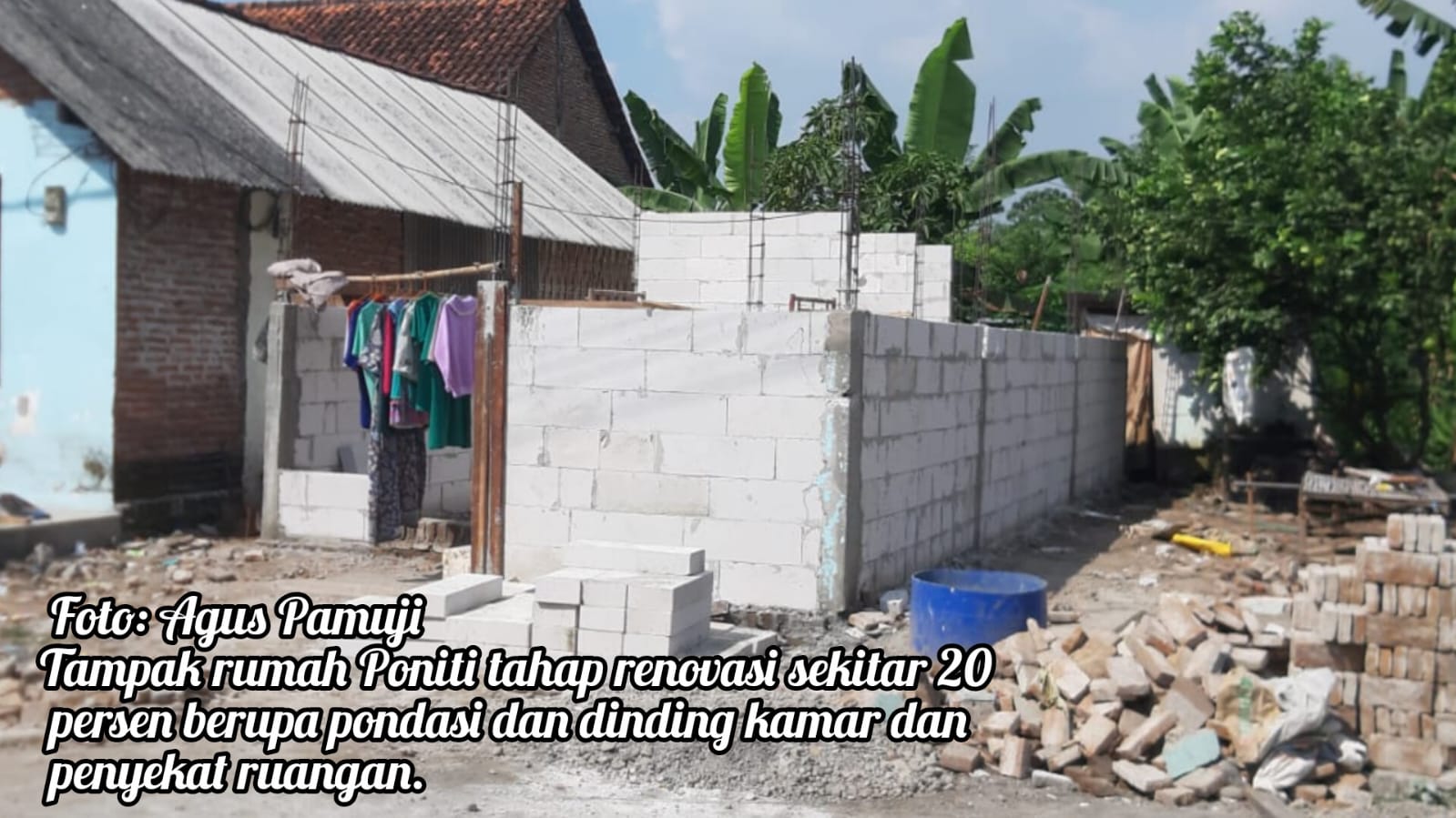 Sayangnya, setelah waktu berjalan tiga pekan ini gubuk reot yang ditinggali Poniti bersama 4 anak dan cucunya ini baru dibangun sekitar 20 persen berupa pondasi dan dinding-dinding mengelilingi area tanahnya tanpa plafon, atap, kusen pintu, jendela dan lantai. Ironis, bagaimana perintah bupati agar rumah Poniti segera dibangun baru yang layak, ternyata belum ada kelanjutannya sampai sekarang.