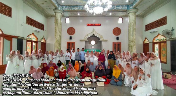 Bakti sosial tersebut menjadi bagian dari agenda rutin kelompok ibu-ibu Khotmil Quran Masjid Al-Ikhlas, yang dengan penuh istiqamah menyelenggarakan pembacaan Al-Qur’an setiap bulan. Kegiatan ini dipimpin oleh Hj. Suruji dan diikuti sekitar 60 anggota yang aktif berkontribusi dalam kehidupan masjid dan masyarakat.