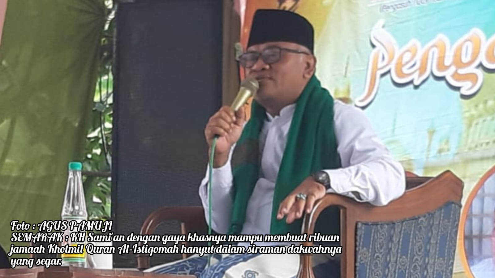 Tiba giliran KH Muhammad Sami’an yang sudah ditunggu para jamaah memberikan tausyiah agama, ia menekankan pentingnya bersedekah dalam kehidupan di dunia “Banyak-banyaklah bersedekah, jangan pelit ya. Sebab, sedekah itu membuka pintu rezeki, pahala dan keberkahan hidup. Orang-orang yang sudah meninggal di alam kubur minta dikembalikan lagi ke dunia agar bisa bersedekah, tapi tidak ada gunanya lagi. Wes kasep (sudah terlambat, red),” ujar Sami’an yang disambut gemuruh jamaah.