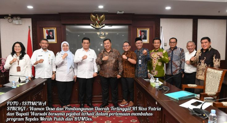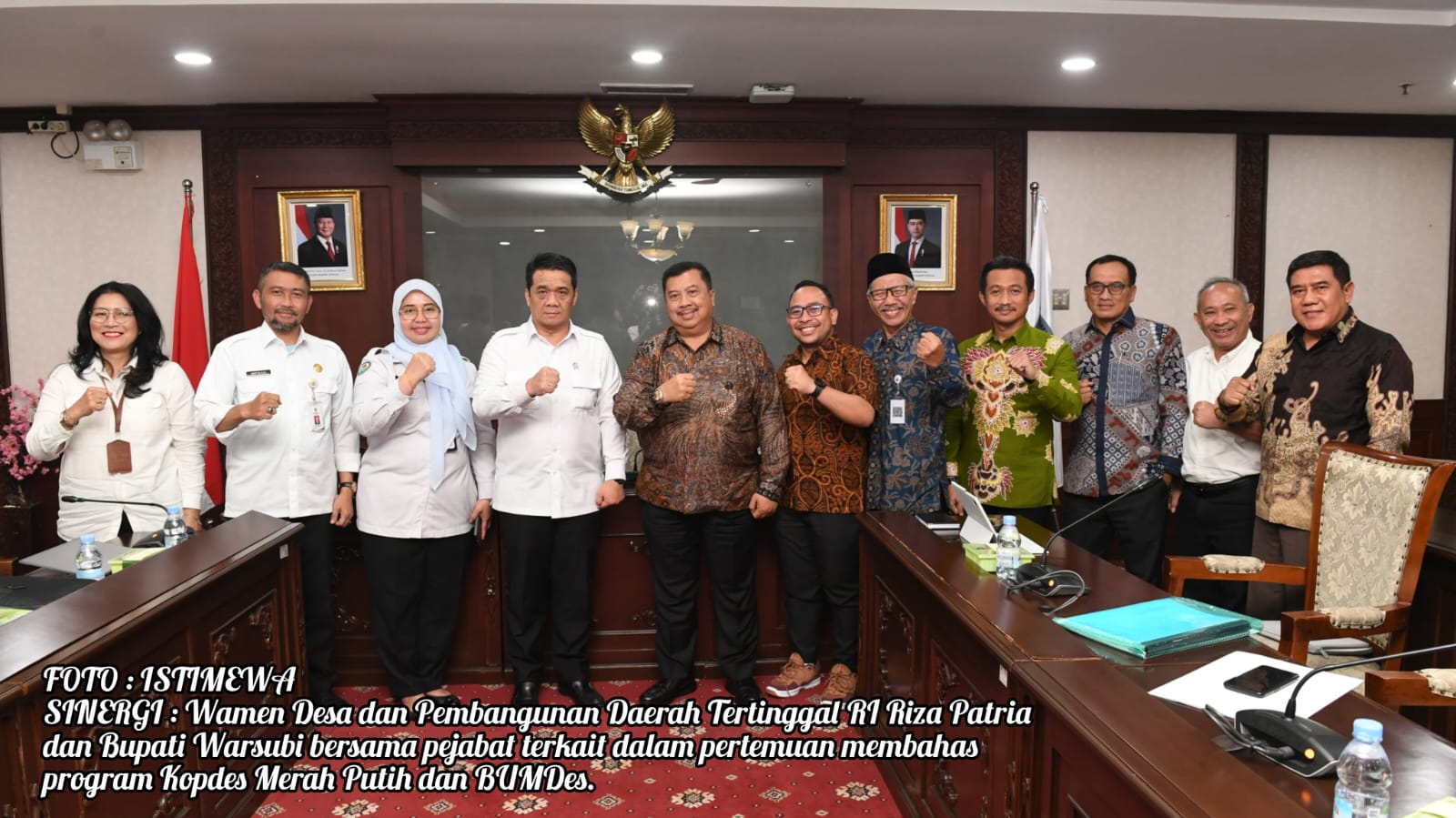 JOMBANG MEDIA NUSANTARA. Com- Wakil Menteri Desa dan Pembangunan Daerah Tertinggal Republik Indonesia, Ahmad Riza Patria, menerima kunjungan Bupati Jombang, H. Warsubi, di Kantor Kementerian Desa PDT, Selasa (5/8/2025). Pertemuan ini membahas langkah-langkah strategis untuk memperkuat sinergi kelembagaan antara Badan Usaha Milik Desa (BUMDes) dan Koperasi Desa/Kelurahan Merah Putih (Kopdes Merah Putih) dalam menggerakkan ekonomi desa secara kolektif dan berkelanjutan.