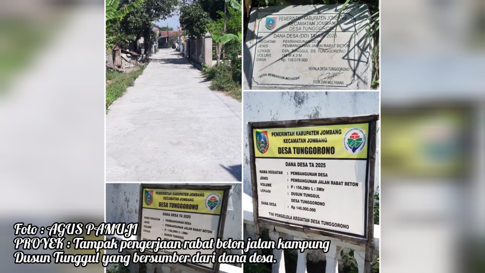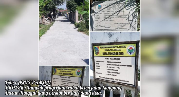 JOMBANG MEDIA NUSANTARA.Com – Proyek pembangunan rabat beton jalan pemukiman di Dusun Tunggul, Desa Tunggorono, Kecamatan Jombang, Kabupaten Jombang, yang bersumber dari Dana Desa (DD) Tahun Anggaran 2024 diduga bermasalah.