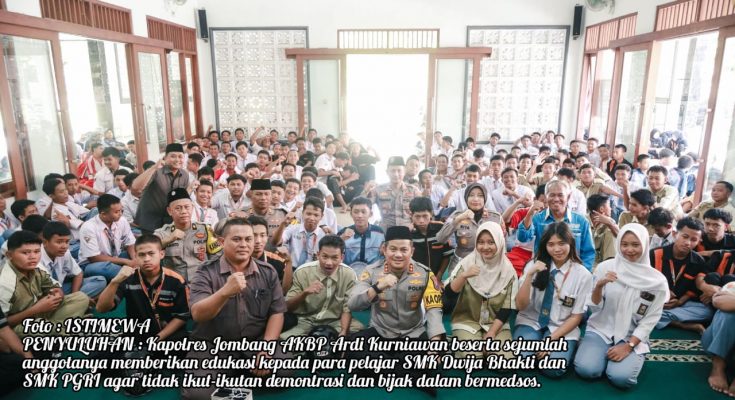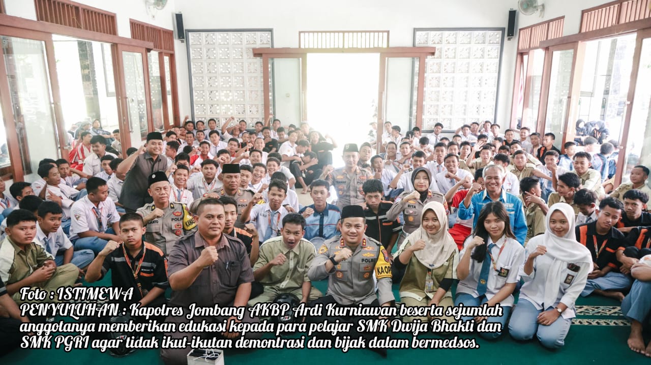 JOMBANG MEDIA NUSANTARA. Com-Kepala Kepolisian Resor Jombang, AKBP Ardi Kurniawan, S.H, S.I.K, CPHR didampingi Kasat Binmas, Kasat Lantas dan Kapolsek Jombang memberikan penyuluhan kepada para pelajar di wilayah Kabupaten Jombang dalam rangka menjaga ketertiban dan keamanan masyarakat (kamtibmas). Kegiatan ini dilaksanakan di SMK Dwija Bhakti Jombang dan SMK PGRI 2 Jombang, Rabu (3/9/2025).
