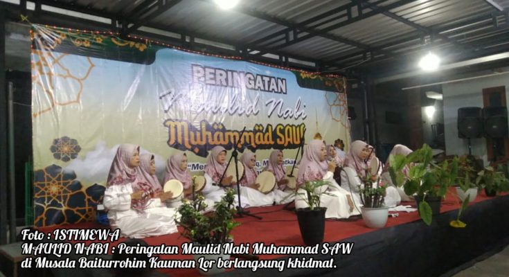 Di Musala Baiturrohim, Kampung Kauman Lor Gang II, Desa Jombang, peringatan Maulid Nabi tahun ini kembali digelar meriah namun penuh khidmat, kemarin malam. Ratusan jamaah hadir memenuhi musala untuk mendengarkan tausiyah KH Ghozi Rofiuddin, pengasuh Ponpes Tahfidzul Qur’an Safinatul Huda, Diwek Jombang.