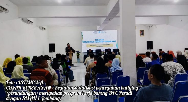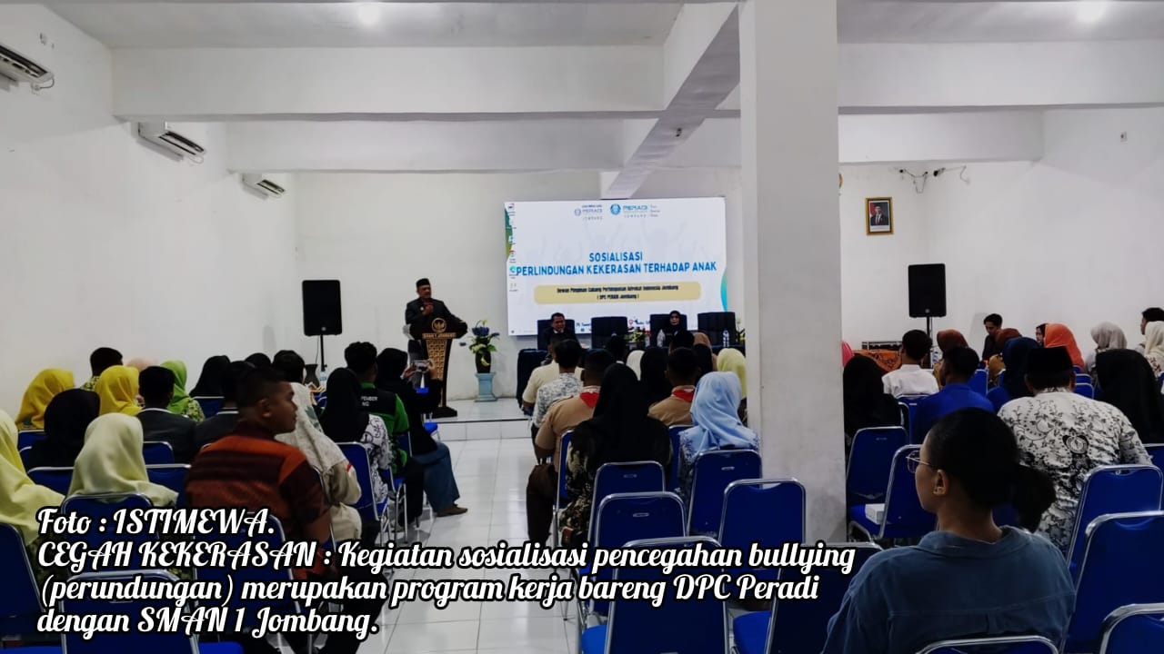 Hal itu disampaikan Ketua DPC Peradi Kabupaten Jombang, H Siswoyo, SH, MH, saat memberikan sambutan pada pembukaan kegiatan Sosialisasi Perlindungan dari Kekerasan Terhadap Anak (Bullying) di Aula SMAN 1 Jombang, Kamis (25/9/2025) pagi.
