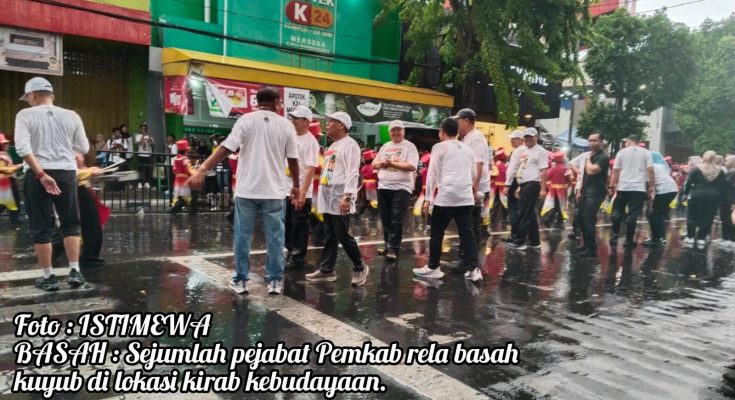 Meski diguyur hujan lebat, para pejabat daerah tersebut tetap berdiri tanpa mengenakan jas hujan sebagai bentuk apresiasi dan semangat bagi para peserta lomba.