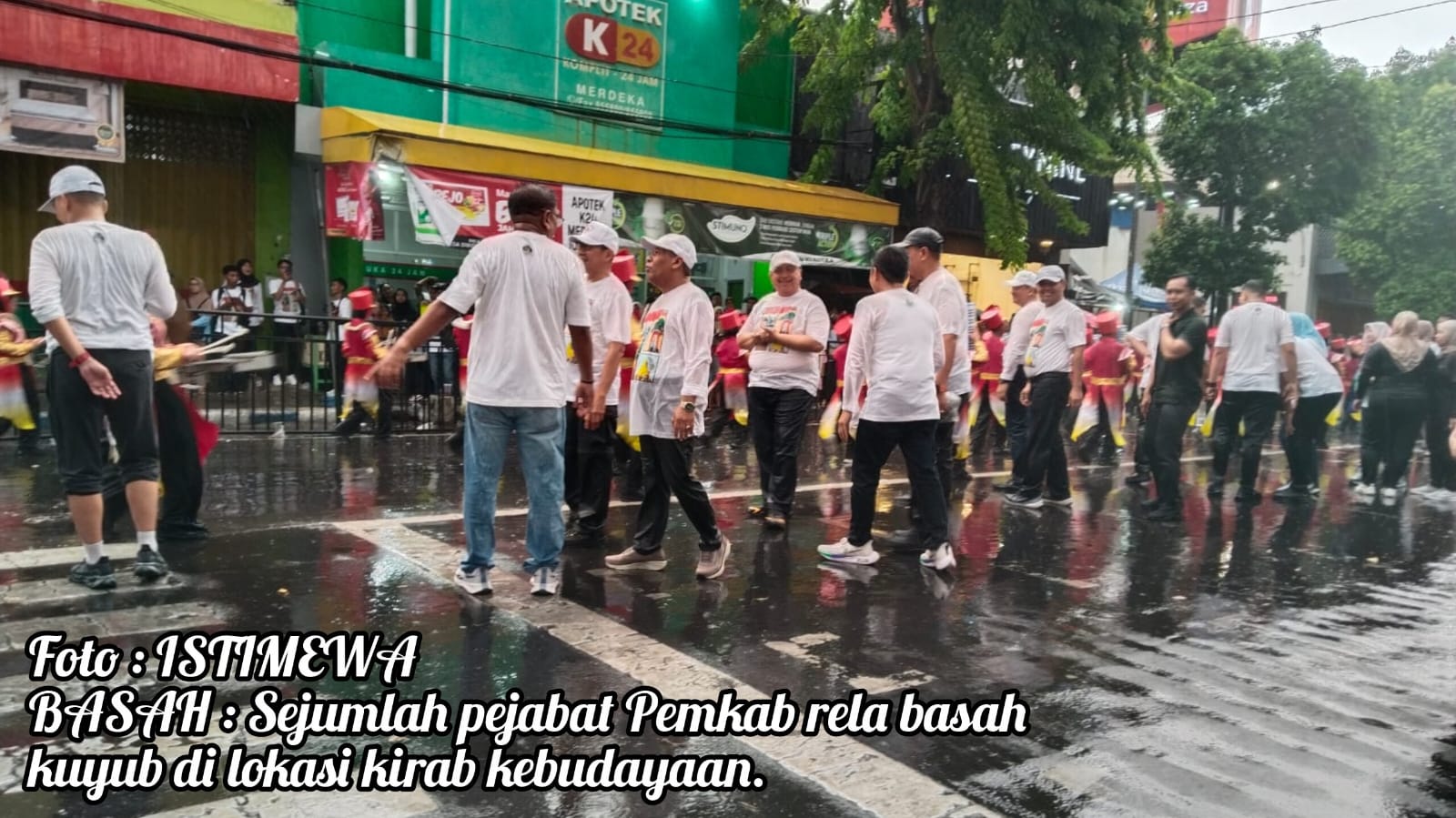 Meski diguyur hujan lebat, para pejabat daerah tersebut tetap berdiri tanpa mengenakan jas hujan sebagai bentuk apresiasi dan semangat bagi para peserta lomba.