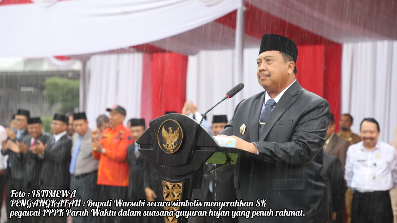 Dalam sambutannya, Bupati Warsubi menyampaikan ucapan selamat yang menyentuh hati. Bupati Warsubi menegaskan, status ASN bukanlah sekadar urusan jabatan, melainkan sebuah panggilan hati yang tulus untuk mengabdi.