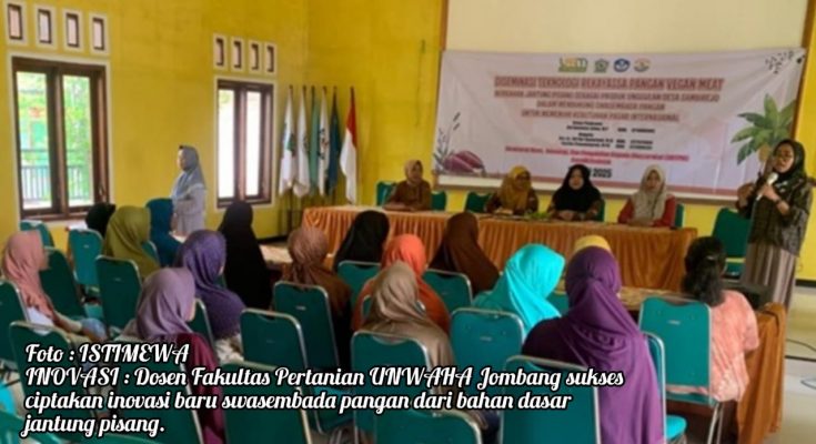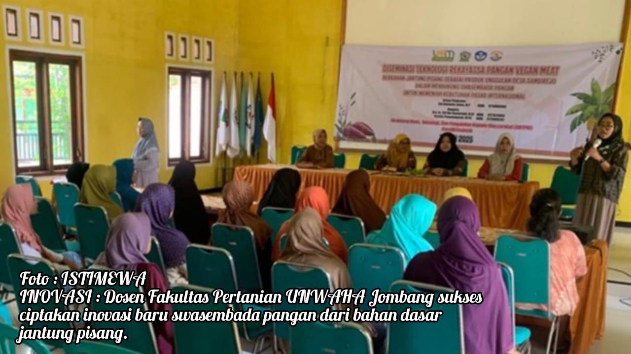 JOMBANG MEDIA NUSA-ANTARA. Com-Dosen Fakultas Pertanian Universitas KH. A. Wahab Hasbullah (UNWAHA) Kabupaten Jombang, Jatim, berupaya mewujudkan swasembada pangan dengan pemanfaatan potensi lokal, salah satunya dengan memperkenalkan inovasi rekayasa pangan Vegan Meat yang berbahan dasar jantung pisang.