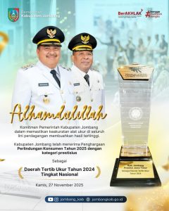 JOMBANG MEDIA NUSA- ANTARA. Com- Komitmen Pemerintah Kabupaten Jombang dalam memastikan keakuratan alat ukur di seluruh lini perdagangan membuahkan hasil tertinggi. Kabupaten Jombang telah menerima Penganugerahan Penghargaan Perlindungan Konsumen Tahun 2025 dengan kategori prestisius, sebagai daerah Tertib Ukur Tahun 2024 Tingkat Nasional.