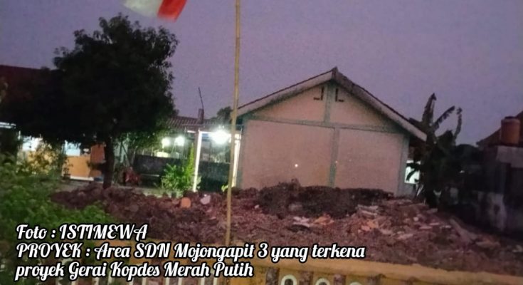 JOMBANG, MEDIA NUSA-ANTARA – Upaya Pemerintah Desa (Pemdes) Mojongapit, Kecamatan Jombang, dalam mempercepat pembangunan Gerai Koperasi Desa/Kelurahan Merah Putih (Kopdes) di halaman SDN Mojongapit 3 menuai kecaman. Pembongkaran sejumlah fasilitas sekolah menggunakan alat berat, Jumat (28/11/2025) terjadi ketika kegiatan belajar mengajar masih berlangsung sehingga memicu polemik dan kekhawatiran besar di kalangan masyarakat maupun insan pendidikan.