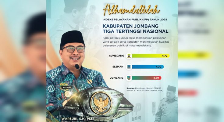 JOMBANG MEDIA NUSA-ANTARA. Com- Pemerintah Kabupaten (Pemkab) Jombang di bawah kepemimpinan Bupati Warsubi, S.H., M.Si. dan Wakil Bupati Salmanudin, S.Ag, M.Pd kembali menorehkan tinta emas di level nasional. Pemkab Jombang sukses menembus Tiga Tertinggi Nasional dalam Capaian Indeks Pelayanan Publik (IPP) Tahun 2025, dan tertinggi ditingkat Pemerintah Kabupaten di Jawa Timur.