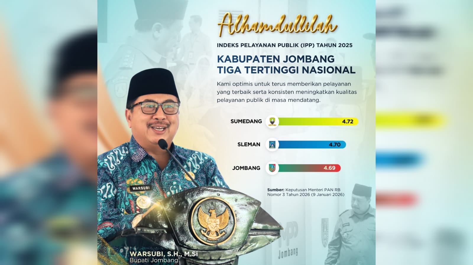 Berdasarkan Keputusan Menteri Pendayagunaan Aparatur Negara dan Reformasi Birokrasi (PANRB) Nomor 3 Tahun 2026, Kabupaten Jombang meraih skor tinggi sebesar 4.69 dengan predikat Kategori A (Pelayanan Prima) dari 415 Kabupaten di Indonesia. Prestasi ini menempatkan Jombang sebagai salah satu Pemerintah Kabupaten dengan tata kelola pelayanan publik terbaik di Indonesia.