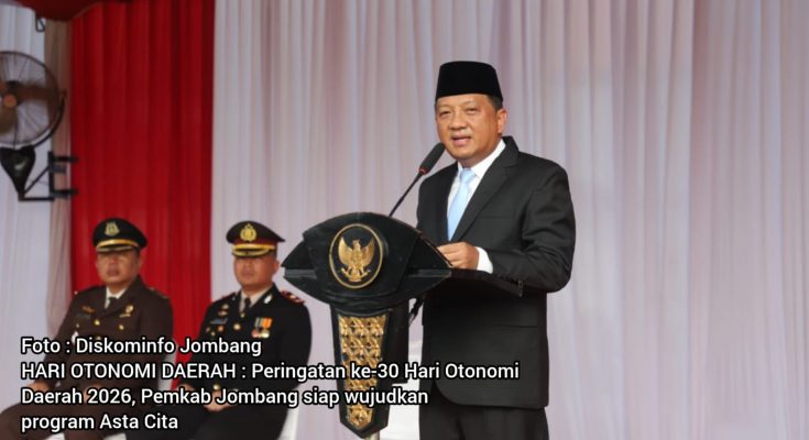 JOMBANG MEDIA NUSA-ANTARA.com’ Pemerintah Kabupaten Jombang mendukung sinergi antara pemerintah pusat dan pemerintah daerah sebagai pondasi mewujudkan pembangunan nasional menuju Asta Cita. Penegasan itu disampaikan Sekdakab Jombang Agus Purnomo, S.H., M.Si., membacakan sambutan Menteri Dalam Negeri pada Upacara Peringatan Hari Otonomi Daerah ke-30 Tahun 2026 di lapangan Pemkab Jombang, Senin (27/04/2026) pagi.